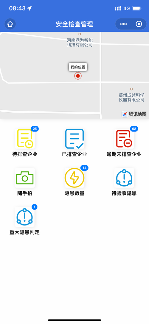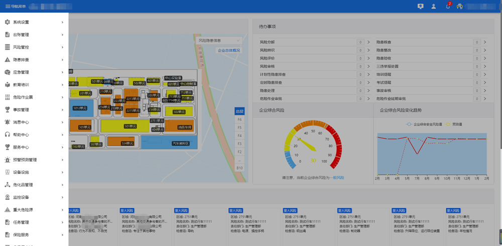 平台为提供托管服务的企业提供智慧安全管理系统,通过安全基础管理、现场管理、风险分级管控、隐患排查治理、教育培训、应急管理等功能,实现企业安全生产全流程在线管理,帮助企业负责人实现安全生产责任制分解、分级管控,全员参与安全管理,同时为第三方安全托管服务提供数据支持及连接工具。